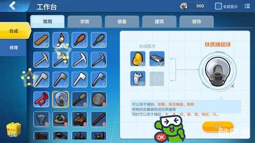 想要捕捉猫的话需要制作捕捉球,捕捉球有铁质,金质,秘银质,高级材料捕捉球一般用于捕捉精英怪,为了节省材料推荐使用铁质捕捉球,铁质捕捉球的材料分别是树脂,铁锭,雪人胡须。收集好材料后在工作台上合成制作。