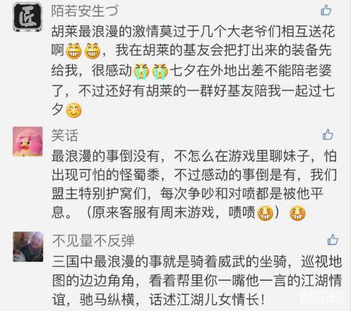 在游戏中可以遇见心意的他,也许是一件意外的美好,希望所有《胡莱三国2》的情侣们都可以一起策马奔腾共白头~当然,除了真正的“狗粮”,也少不了咱们老爷们之间的“基情四射”