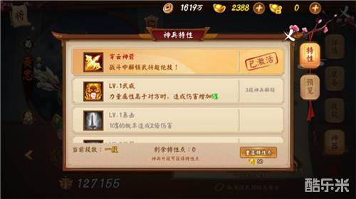 神器除了可以升级之外,还能通过消耗特定材料来升段,达到指定段位,还能激活特性,让武将战力飙升。升段所需要的材料为五色石,通过参与群雄逐鹿活动可以获得,还需要相应的装备和一定的铜币就可以完成升段,越高的段级对于神兵的加成也会越大。神兵激活的特性分为特性大致分为两大类,一种是增加自身防守能力比如增加防御与速度,第二种增加自身进攻能力比如造成双倍伤害与额外伤害增加。玩家可以根据不同的阵容,通过特性重置来选择特性自由搭配,不过要注意的是,特性还需要神兵达到指定段级才能激活哦。