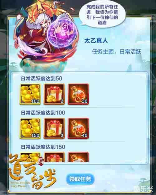 每个神仙都有一个任务主题,任务主题下有若干个与任务主题相关联的任务。每完成一个任务都可以领取奖励,当玩家完成该仙人的全部任务,可以解锁前往下一位仙人的道路。