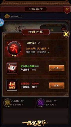 书籍等级需要强化卷轴或者书籍经验才能提升,前者需要完成任务或者成就或者元宝购买,后者可以通过出使衙门(相当于PK)和书院学习获得。
