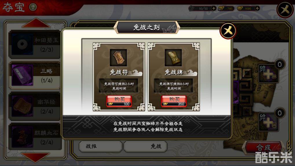 想必主公也很烦恼,如被敌军恶意针对,心中烦闷,如何解决?唯有“免战”以绝后患!只用花费少许元宝即可购买“免战牌”在免战时间内防止敌军抢夺自己珍贵的宝物!