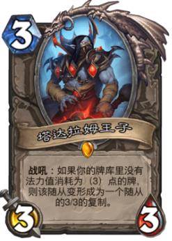 塔达拉姆王子:三王子的优势在于复制虚空领主的时候,能够提供多个嘲讽。但是这中操作在面对快攻的时候很多时候打不出来。除此之外,三王子也没有很值得复制的对面的随从。为了三王子,还得放弃其他的三费随从,所以选择不带。