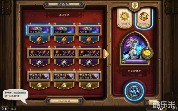 恶魔园:个人感觉应该是个6 4开对局,但近期实战中我全输了,各种花式输掉,被766烈焰使者打死。大哥+血怒+恶魔火打死,恶魔园给的压力比二王子园大的多,起手留牌:末日,秘法,过牌,雕文。和对阵鱼人骑一样,2费准时压末日,与鱼人骑不同的事,2费如果不雅末日,基本就凉了。血怒。恶魔火+454对场面压力实在是大,切记,只要对面1费有怪,直接末日绝对没错。理论上,6费后,工匠+暴风雪基本可以稳住反杀,但我在实际对局中,并没有打出过这样的操作。但根据我的游戏理解,这在带上奥数工匠后是一个均势对局。