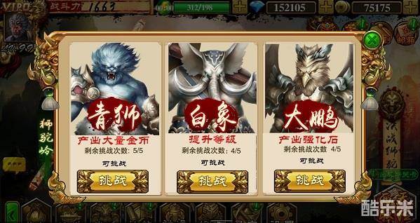 当然“决战狮驼岭”不仅有经验副本,还有强化石副本和金钱副本,是助您提升实力的最快捷的途径,所以这些东西每天都要打的哟!~