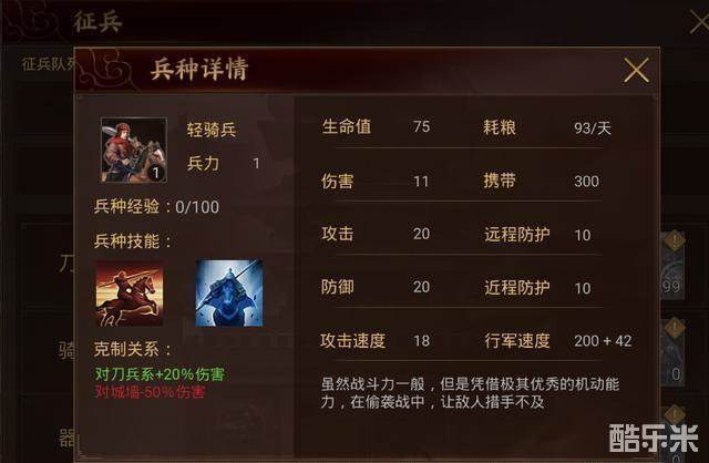 结合各类骑兵的属性,在游戏前期,骑兵和轻骑兵作为初期兵种足够使用,特别是轻骑兵拥有游戏中最快的行军速度,可以用来抓将、抢占资源。而巡逻骑兵相应征召一些,以应对别人发起的突袭等突发情况,这样队伍在速度上面就比较出色,而且在游戏前期也不会有太多和周围玩家的摩擦,以掠取资源,发展自身为主,这样可以做到有效的利用前期资源,实现收益最大化。