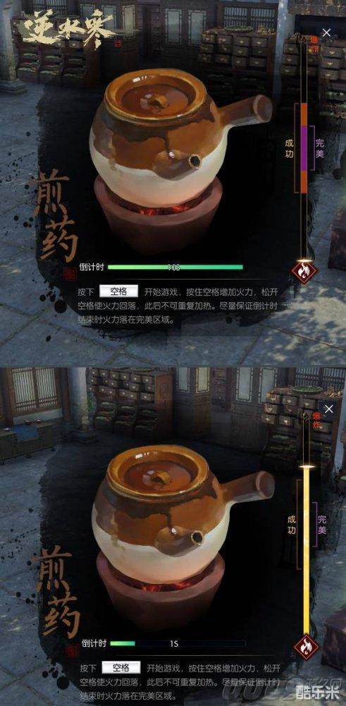 例如制药技能里,在煎煮汤药时,加入了一个把握时机的小考验,玩家需要精准掌握火候,才能熬出一幅品质上乘的汤药。对火候的掌握,不仅仅是把药罐加热到完美区间那那么简单,玩家还得考虑火力回落,停止加热后猛火的火力值会稍微衰退回落,能恰好落在完美区间才算是妙手郎中。