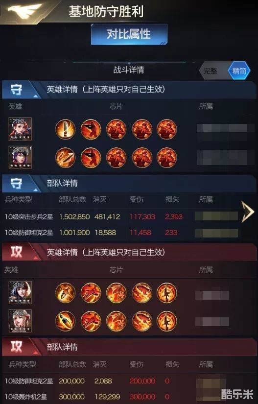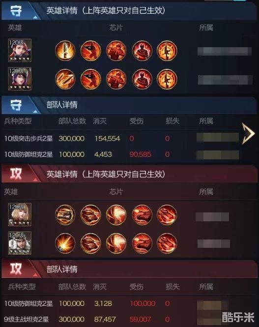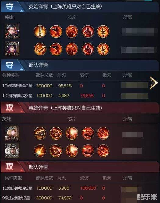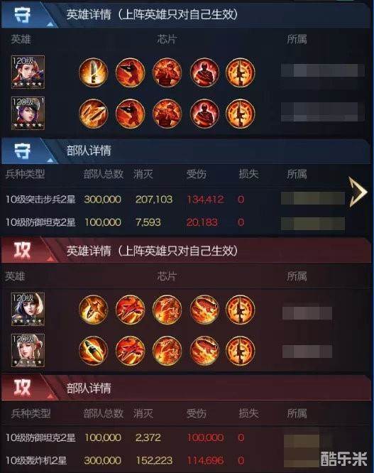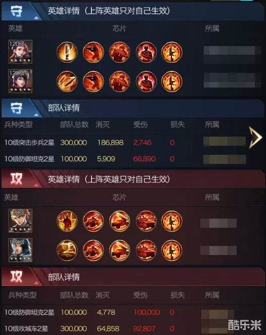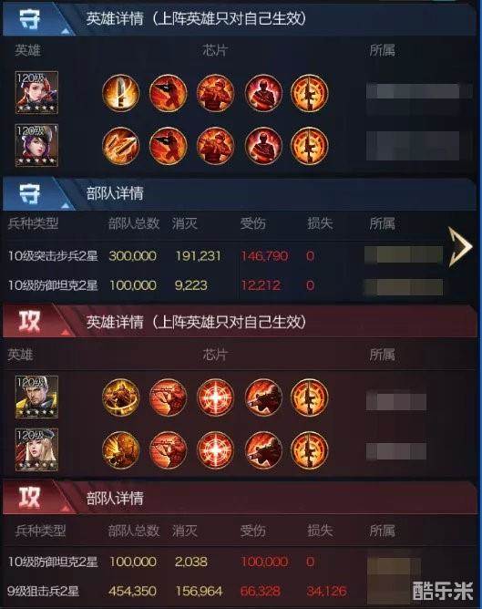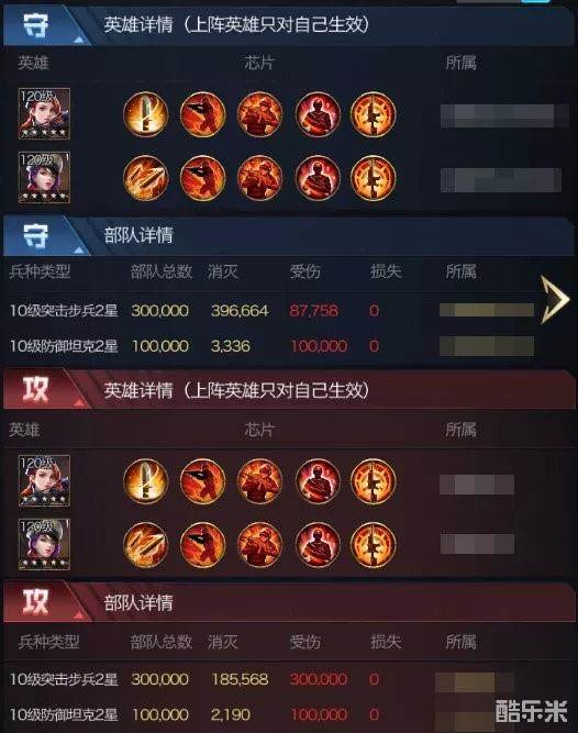 由于团战时均为极限防坦,突击步兵在集结中一直较为疲软,甚至无法参与集结,但是在单人作战,以及专注进行搭配的芯片时,可以称得上是目前版本中无法撼动的绝强守城模式!上图为同级别对战,20万防坦依然被团灭,且轰炸机自身仅仅输出了11万兵。正常情况轰炸机是能输出到20万,那么也就是说防守方破防后团灭对方,攻击甚至还有一定的输出空间没有打全。即便攻击方出到30万防坦,基本上也会被破防。