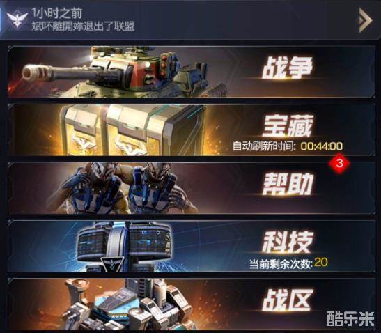 打开图标后,我们可以进入联盟宝藏的界面,当然有熟练的指挥官可以从游戏右下角“联盟”按钮自行打开。在这个界面,我们可以开启自己的宝藏和协助盟友开启宝藏。