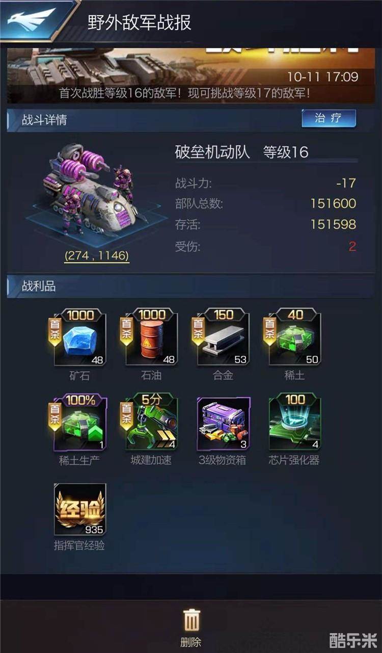 3、【野外敌军战报】:与【野外敌军】战斗的相关【报告】,指挥官可以通过【野外敌军战报】看到野怪的等级、奖励和我军受伤情况,也可以直接通过战报里的【治疗】按钮医疗伤兵。