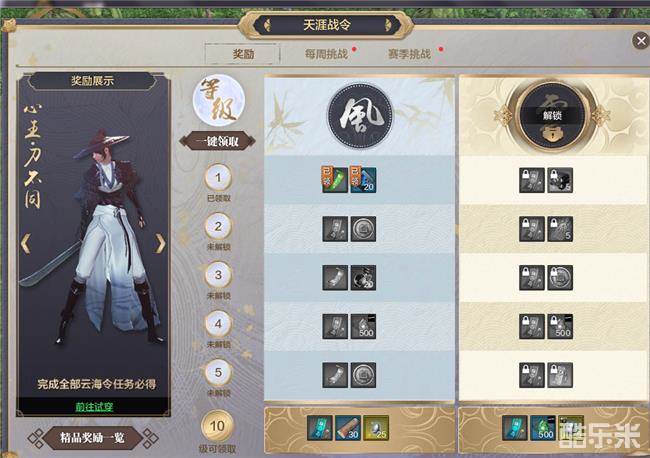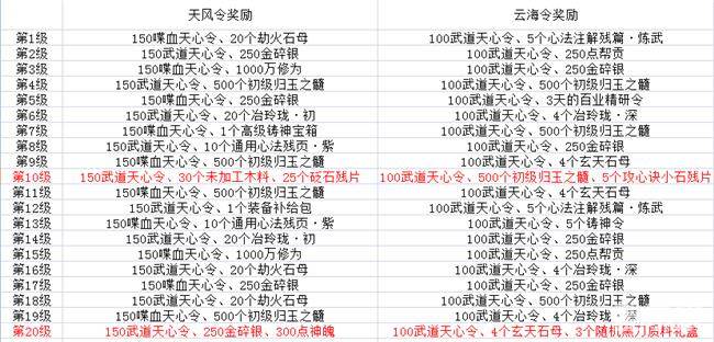 我们可以看到在第10级的云海令中可以领取5枚攻心诀小石碎片,攻心诀小石碎片在现在的这个版本中是非常重要的;第20级可以领取的黑刀质料虽然不多,却也必不可少。