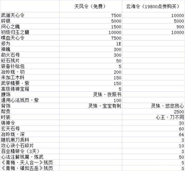 天涯战令分为天风令和云海令两种,云海令需要少侠花费19800点券购买。
