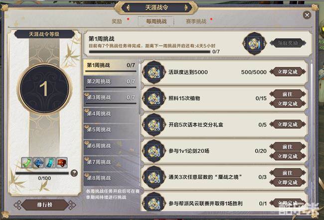每周共有7个挑战,完成挑战就可以获得经验,100点经验可以升一级。
