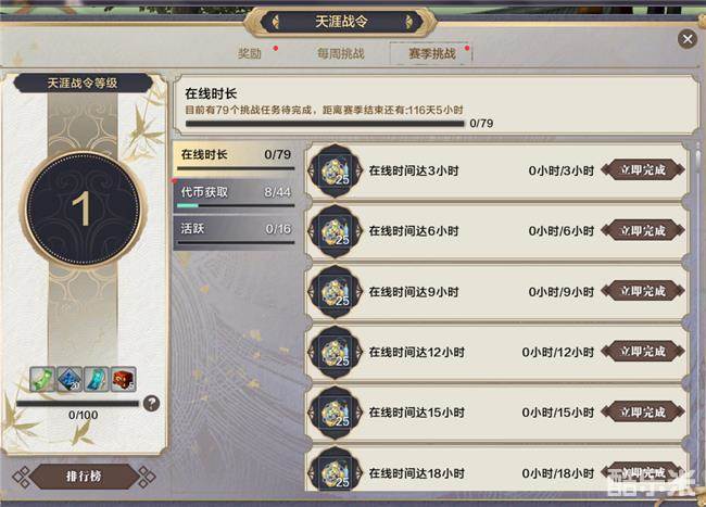 天涯战令可以通过完成每周挑战和赛季挑战来进行升级。
