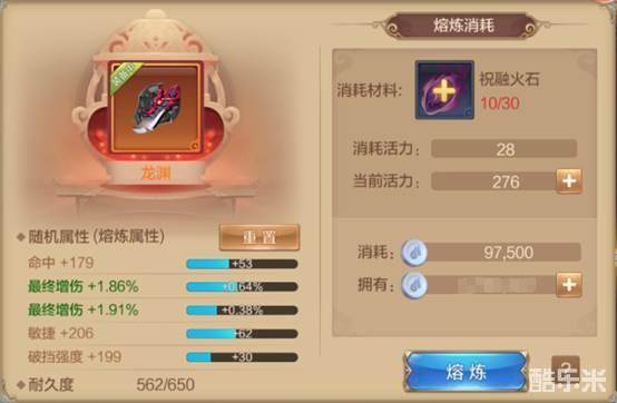 不过,小编推荐大家的是,如果有需要率先熔炼的一定是武器,增加自己的战斗能力才是硬道理。尤其是在卡级的情况下,熔炼是很好的增加自己战斗力的方法。但是在低级别下,小编不建议大家去先行熔炼装备,这是一种极其消耗资源的做法,更不用说想将某一条属性熔炼到完美了!