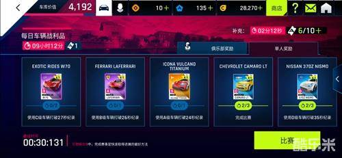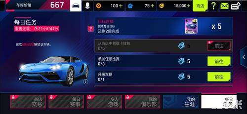 狂野飙车9每天都会更新每日任务,完成每日任务即可获得车辆卡牌。