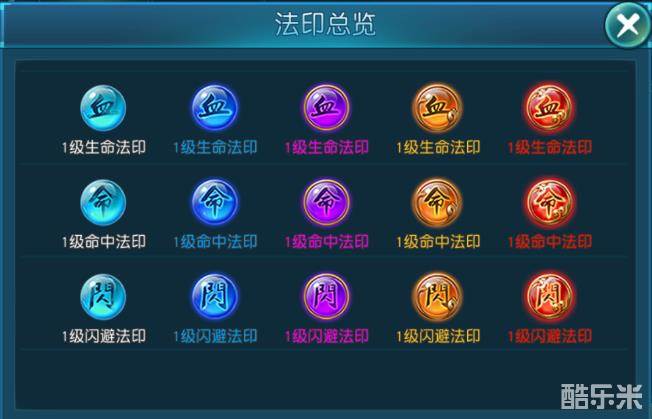 法印有多种类型,分别可以增加不同的属性,如攻击力、生命值、防御值、命中、闪避、暴击等等。通过挑战法印塔副本可以获得法印,通过寻宝可以获得法印碎片。