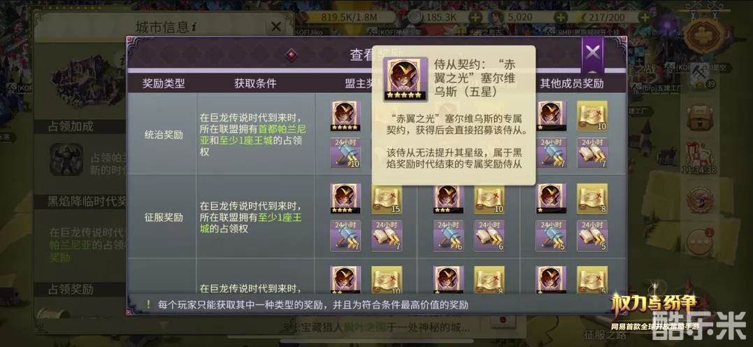 除了荣耀无限的国王奖励之外,在巨龙传说时代到来之时,所在联盟拥有首都帕兰尼亚和至少一座王城占领权联盟的联盟成员,也将获得“统治礼包”,该礼包中将包含全新侍从——“赤翼之光”塞尔维乌斯的侍从契约!