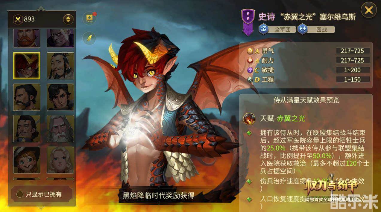 作为能够抵御黑暗的传说级侍从,“赤翼之光”塞尔维乌斯是火龙一族最具天赋的战士,他的天赋将能够帮助领主们“扩充军医院容量”,让大家在战斗过程中以更高的效率加快伤病回复速度!不止如此,随领主们出战的时候,“赤翼之光”的天赋效果还会更加强大,原有的增益属性将会被进一步提高,帮助领主们在战斗中越战越勇,所向披靡!