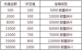 【活动内容】活动期间可通过充值金币获得好运值,积累好运值即可打开宝箱奖励,超多的徽章碎片,徽章等级不断攀升,绝对超值的提升战力资源,尽在特惠好礼。