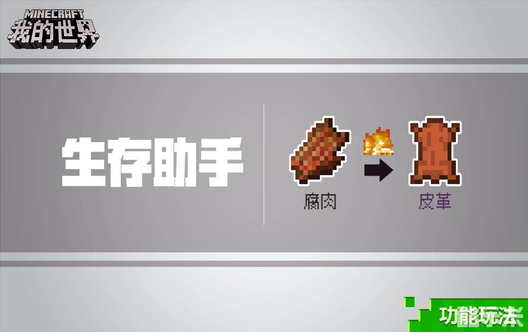 历经艰辛挑战僵尸的掉落只有腐肉,弃之可惜食之中毒,《[MH]生存助手-腐肉变皮革》为腐肉带来了新的可能~只需要加载玩法,经过冶炼炉的简单加工,腐肉即可烧制成皮革,爱护生物又环保。