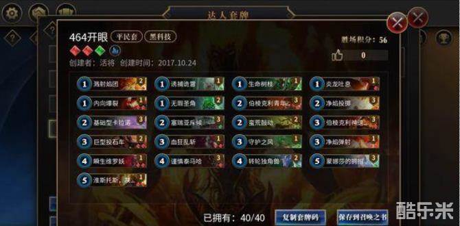 这套牌比较均衡,几乎任何套路都可以一战,笛子、守护之风防魔法,输出有446小大哥,222赛瑞亚斥候可躲角,+5、5后输出爆发,火系有解、能砸脸,可根据不同对手选择起手牌。