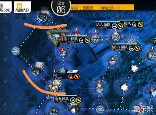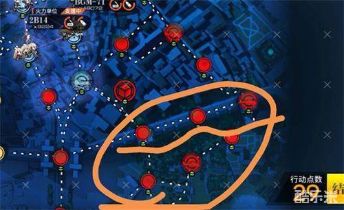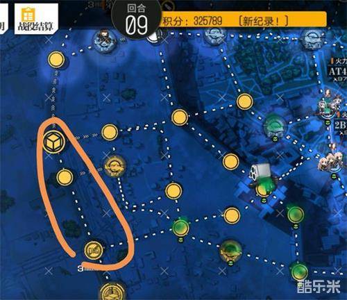 这边是高达跳跳还有新敌人的区域。划线的那一块是炮台,会进行炮击支援,打仗之前先派重装去炸了,这边我个人认为是刷分的好地方,有刷7-8w效能的新型蜘蛛型敌人。