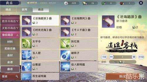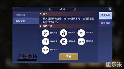 曲谱演奏分为经典曲谱和自由曲谱,经典曲谱有的需要剧情或者奇遇获得,有的则通过身份商店购买,绝音,折红英,太平令,破阵子等端游经典曲目,在手游中也是得到了还原,但是所带来的buff并不同: