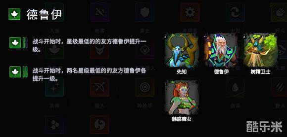 德鲁伊的buff由场上有2个相同的1星德鲁伊就可以升级为2星,改为星级最低的友军德鲁伊提升一个等级。