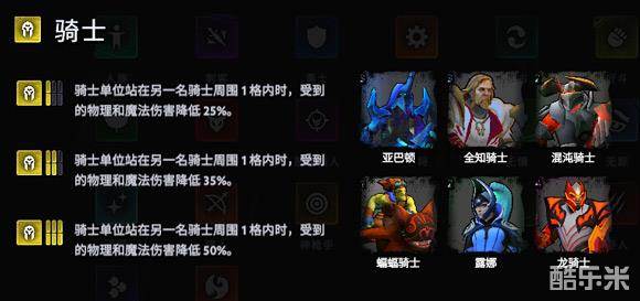 骑士的buff由所有友方骑士获得护盾,改为两个骑士站位相邻时受到伤害降低。
