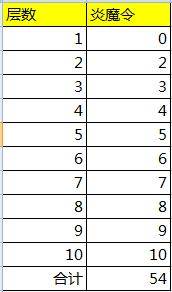偷偷告诉大家,每一次的活动结束之后背包上的炎魔令是不会消失的,可以留作下一次的活动使用。所以到达第十层击杀完BOSS之后,可以留在第十层刷炎魔令,从表中可以看到,只要刷够54个炎魔令,下一次活动就可以直接到达高层数优先击杀BOSS了。