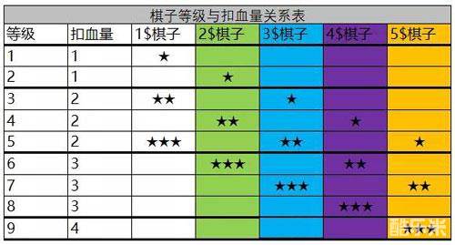 棋子扣血量与棋子等级存在映射关系:扣血量=Roundup((棋子等级+1)/3,0)。用语言表述为,棋子等级加1的和与3的商向上取整的值即为扣血量。