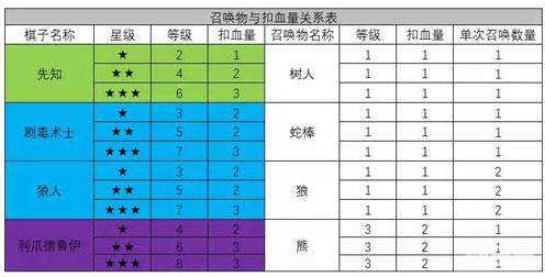 与棋子一样,召唤物同样具有等级的概念,同样满足等级与扣血量的映射关系。具体的,大家就看看下表吧。