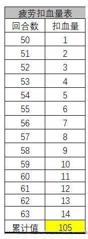 打完50波肉山大魔王后,玩家将进入疲劳期,疲劳期每回合准备阶段开始前玩家会扣血。比如51回合的准备阶段开始前会扣1血,52回合的准备阶段开始前会扣2血,依次类推。具体关系如下表所示: