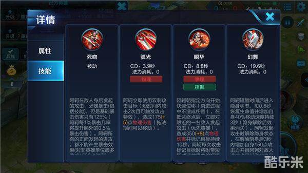 被动-死吻:阿轲从敌人身后发起的攻击,必定暴击,是阿轲的爆发所在。