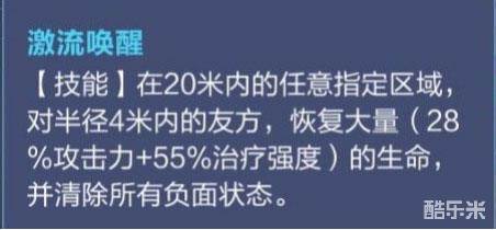 技能介绍:对指定圆形区域内的队友回复一共28%攻击力+55%治疗强度的生命并移除所有debuff。技能CD:10秒