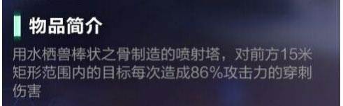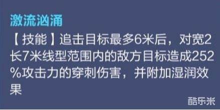 技能介绍:对前方长方形区域内的一个敌方目标造成252%破甲伤害,并附带湿润效果。