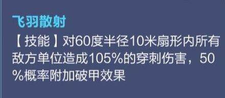 技能介绍:对前方扇形区域内的敌方造成一共105%破甲伤害,有50%概率附加破甲效果。