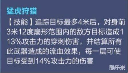 技能介绍:对前方扇形区域的敌人造成共152%伤害,六秒内造成16%×6的流血效果并减速30%。