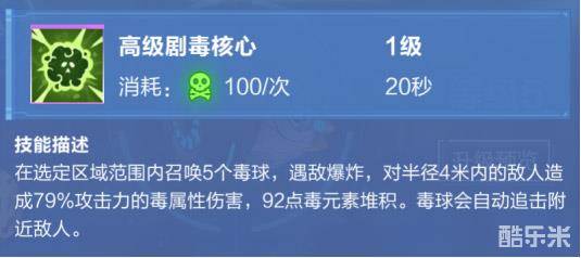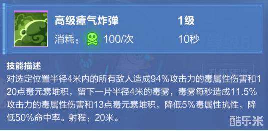 简评:范围技能/群体伤害/持续伤害,此技能有一个容易忽略的区别之处:高级技能的描述是每秒对毒雾内敌人造成伤害,换言之,只要敌人走出这片毒雾就不再受到伤害了。而初级技能是使目标中毒,无论敌人走到哪里都会受到伤害。由此看来,初级技能更适合打运动战,高级技能则适合打站桩战。建议配合减速或定身类的武器、宠物技能,限制敌人移动,打出更持久的输出。