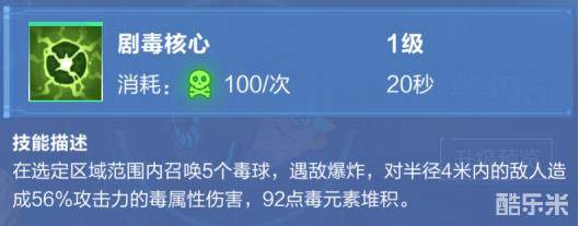 简评:范围技能/单体伤害/溅射伤害,打单体效果一般,打兵堆时毒球的溅射伤害相互堆叠,效果拔群。高级技能的自动追踪功能保证了每放一次技能都能打出满额甚至超额伤害。用法方面,建议直接扔在兵堆里或者在运动战时用来封路。不过此技能的冷却时间较长,要视时机使用;毒球索敌也有短暂的延迟,当敌人站位比较分散时,记得长按技能键看看自动锁定的敌人是不是自己想打的。