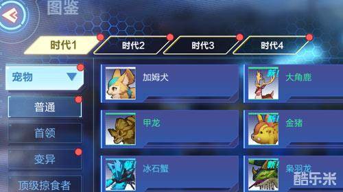 游戏内共有四个时代,每个时代的宠物宠物都有【普通、首领、变异、顶级掠食者】个类别,类别越往后品质越优秀(时代不影响品质)。