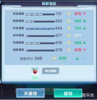 ④刷新潜能时,刷到满意的记得点击【保存】按钮,没有刷到满意的可以点击不保存,但是【仍然消耗彩虹苹果】