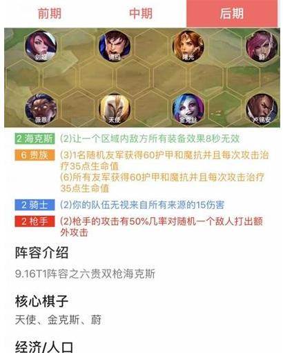 过渡就是按照3贵族2骑士或者2斗士为前排,双枪为后排来构筑,装备以德莱文金克斯的标准三件套作为优先,但是有春哥优先合成起码一个春哥给你的前排打工仔,这是前期被入也不会被血入的关键。