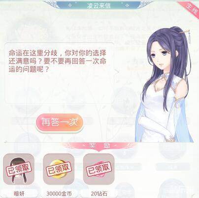 同样根据剧情做的选择的回答即可,完成任务后获得奖励:水清浅、20000金币、20钻石、20体力