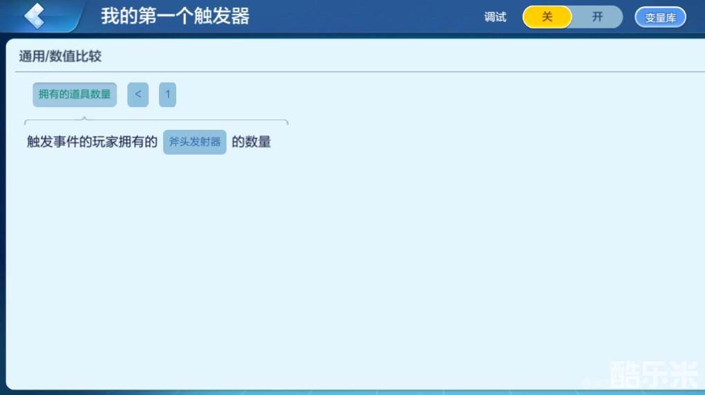 因此,我们需要设置一个限制,也就是,只有我们已有的“斧头发射器”数量为0时,才触发添加道具的动作