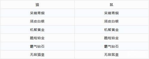 目前游戏中的猫、鼠段位各分为6个段位,每个段位分为1-5级。在小伙伴们达到无敌猫皇、无敌鼠皇的最高段位后,将以胜点累计进行排名。