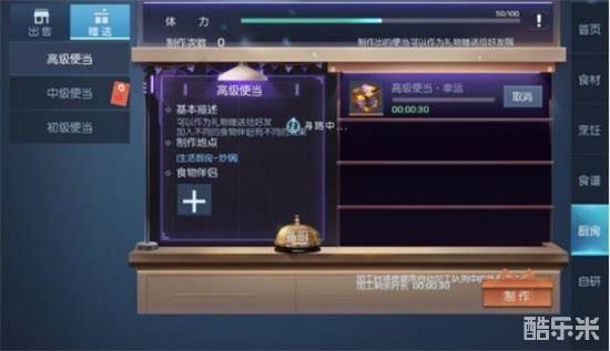 最受选择了厨师副职的玩家们重视的除了花样繁多的自研以外,就是相对朴实的便当。便当没有太过复杂的食谱,但也存初中高三级的划分并且会影响到食用效果。