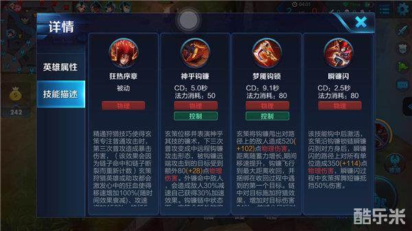 该技能具有多种效果,在单挑时很强,狩猎效果可以使自己受到的伤害降低,也可以让敌方英雄的输出降低。技能蓄力时会获得不错的移速加成,只要不施放出蓄力的钩镰可以用来作为加速技能使用,并没有蓝量消耗。技能命中后的二段效果可以把敌人拉到自己身后并且带有短时间的晕眩效果,作用类似钟馗的钩子。