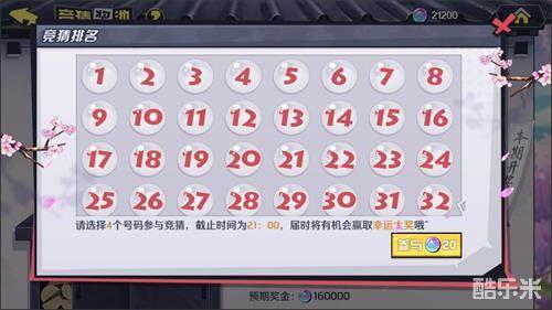 每天21:00竞技场结算的同时,进行开奖仪式:将从32个号码中抽取4个号码做为幸运号码。当4个号码完全一致时,将获得竞猜大奖。